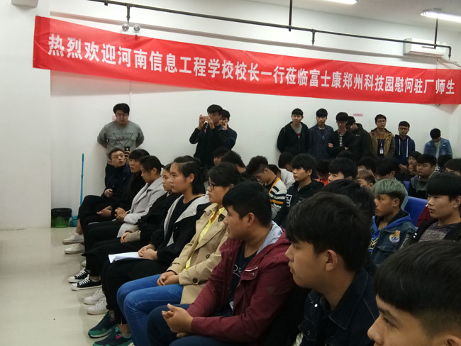 2016年10月23日下午16时,在寇守峰校长、宋廷楷副校长的带领下,学校教务处、学生处、招生就业处、党政办等相关部门负责人一行,利用周末休息时间,冒雨前往港区富士康科技集团园区慰问我校2015级工学交替的学生。
