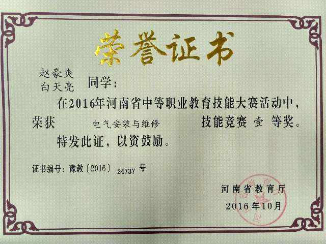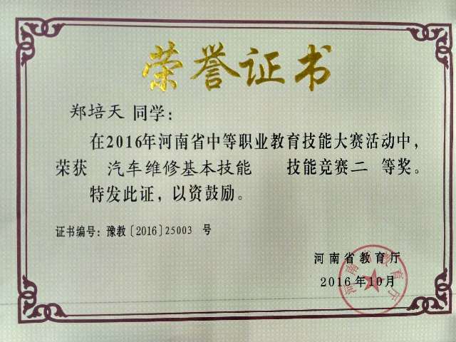 根据河南省教育厅、河南省人力资源和社会保障厅《关于举办2016年河南省中等职业教育技能大赛的通知》(教职成〔2016〕133号)精神,经学校批准,2016年10月中旬,机电工程系选派机电技术应用专业4名选手参加了在郑州电子信息工程学校举办的《电气安装与维修》和《机电一体化设备组装与调试》两个赛项;汽车应用与维修专业4名选手参加了在郑州国防科技学校举办的《汽车维修基本技能》和《汽车定期维护和车轮定位》两个赛项,并分别获得一个一等奖、一个二等奖和两个三等奖。