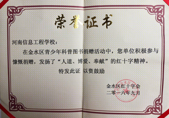 为全面贯彻党的教育方针,落实“育人为本、德育为先、能力为重、全面发展”的教育总要求,教育引导和促进青少年安全健康成长,金水区红十字会开展了“关爱青少年健康成长系列丛书”捐赠活动。我校在爱心捐赠活动中,积极参与,为农科路小学捐赠了《关爱生命—中小学生防灾减灾应急手册》、《消防卫士—中小学生防火用火自救手册》、《青春密码—中小学生预防犯罪教育手册》、《交通安全—中小学生交通安全教育手册》等青少年科普图书50套,发扬了“人道、博爱、奉献”的红十字精神。