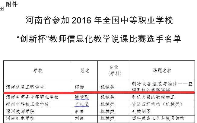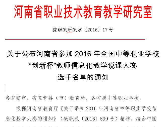 2016年9月27日,河南省中等职业学校“创新杯”教师信息化教学说课教学技能大赛圆满落幕,从大赛现场传来喜讯,代表我校参加省赛的教师郑彬在激烈的竞争中脱颖而出,摘得一等奖第一名大奖,并获得代表河南省参加2016年全国中等职业学校“创新杯”教师信息化教学说课大赛参赛权!