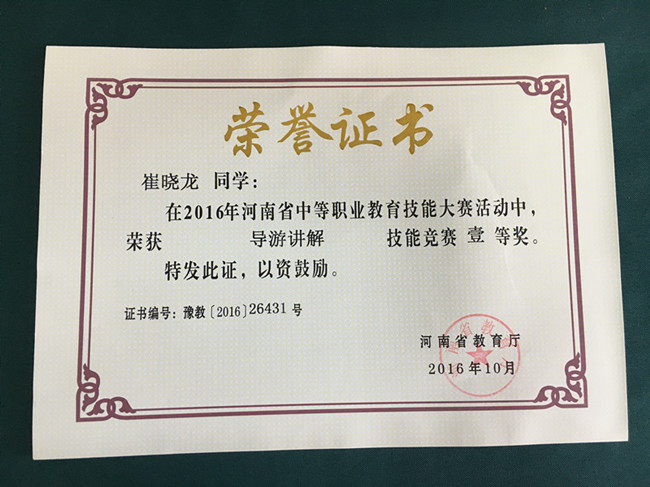 根据河南省教育厅、河南省人力资源和社会保障厅《关于举办2016年河南省中等职业教育技能大赛的通知》等文件精神,通过项目申报,经学校批准,商务系选派董海洋、马利颖、王晓可、桑晋芳4名学生于10月22--23日在平顶山举办的“2016年河南省中等职业教育技能大赛旅游服务类茶艺技能竞赛”中再创佳绩,获得小组赛二等奖。此小组赛由尹顺丽老师辅导。