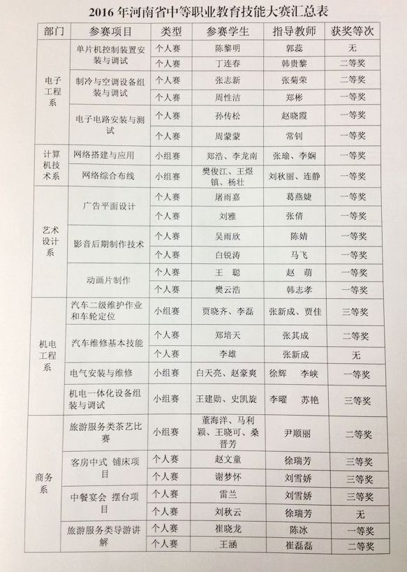 为了贯彻落实教育部《关于深化职业教育教学改革全面提高人才培养质量的若干意见》,努力提高广大师生技能水平,切实加强技术技能人才培养,全面提升中等职业教育教学质量,省教育厅、省人力资源社会保障厅定于2016年10月份联合举办“2016年河南省中等职业教育技能大赛”。我校作为省级示范学校,国家重点中等专业学校,省及国家级技能竞赛先进单位,积极响应,报名参加了六个专业大类十六个赛项26个小项的比赛。