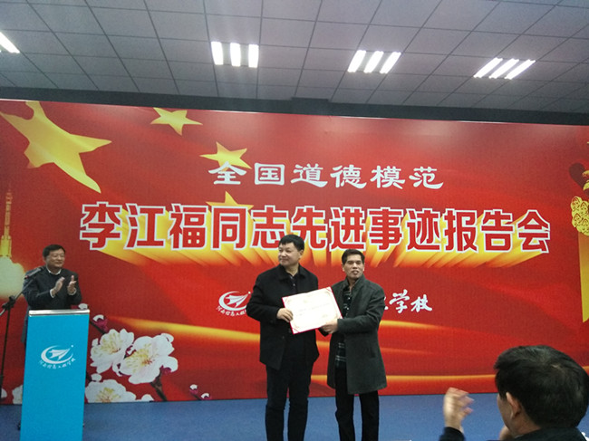 李江福同志是我省林州人,2015年被评为全国诚实守信模范。他的演讲报告题目是:“诚信使人生出彩。”在报告中指出了五点:一、人过留名,雁过留声,诚信伴随我的成长。二、讲诚信不吃亏,讲诚信天地宽。三、要对得起自己的良心,绝不拖欠农民工一分钱。四、我们不仅要盖诚信大厦,还要当诚信的“种子”。五、讲诚信,能够使你的人生更加出彩。李江福铿锵有力、生动深情的演讲,诚实守信的事迹博得了全校职工的阵阵掌声。演讲结束后,李江福同志被聘为我校德育辅导员。寇守峰校长为李江福同志颁发了辅导员证书,郭瑞山书记做了总结。