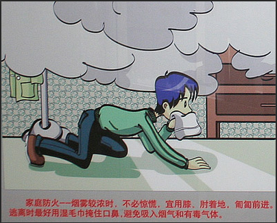 据统计,在美国的火灾中,因烟雾而窒息或中毒造成死亡的人数占遇难者的三分之二以上。为此,专家建议,用湿毛巾将鼻子和嘴捂住,尽快地撤离火场。如果火势过猛,出口通道被浓烟堵住,且没有其他路线可走,可用湿棉被做掩护,贴近地面的“安全带”,匍匐通过浓烟密布的走廊和房间。绝对不能以身体站直的姿势去跑。因为冷热空气是对流的,有毒烟气飘浮在房屋空间的上部,而贴近地面的地方会跑进一些新鲜空气供人呼吸。站着跑很有可能无法呼吸,窒息而死。如果自己的衣裤着火,应该立即脱掉,或在地上打滚,将火弄灭。若有人惊惶而逃时衣裤带火,应将其按倒在地打滚,直至火熄。