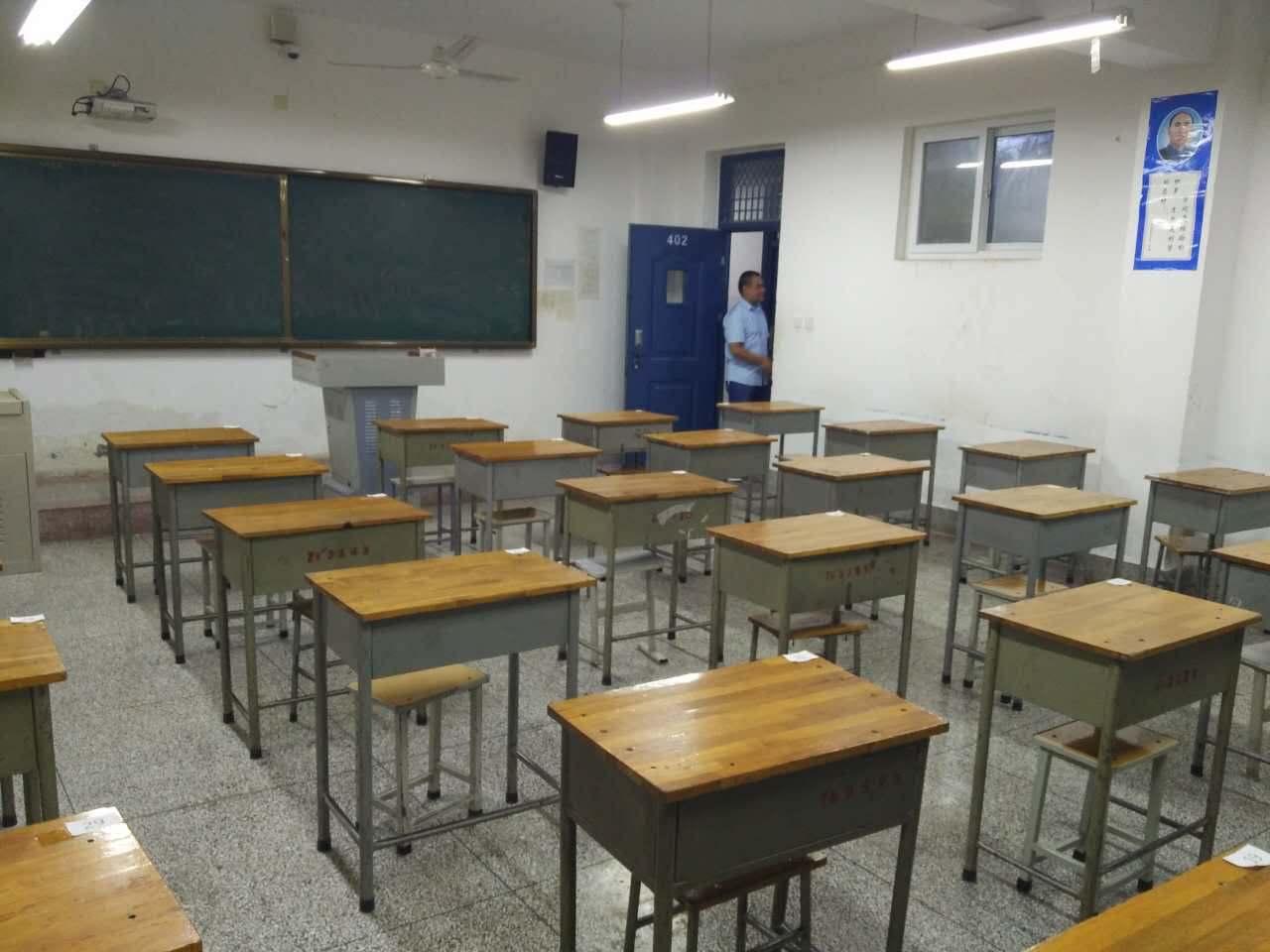 明天我们学校又迎来一场大型的考试,我们的工作人员现在正在忙碌的准备考场。感谢各个相关科室的鼎力支持,学生处闫老师说在教学区发现一个烟头,自罚十块钱。也希望各个老师在教学区进行监督并做好榜样。