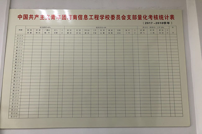2017年9月,学生处(团委)正式启用2017-2018学年中国共产主义青年团河南信息工程学校委员会支部量化考核统计表。为了贯彻落实共青团中央、教育部《中学共青团改革实施方案》的精神,保证我校共青团工作的有效开展,结合我校实际情况,2016年特制定支部工作考核办法,并结合本办法制定各支部量化考核统计表。