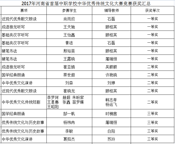为贯彻党的十八届三中全会关于完善中华优秀传统文化教育的精神,弘扬中华优秀传统文化,树立文化自信,以教育部《完善中华优秀传统文化教育指导纲要》为指导,落实《教育部关于深化职业教育教学改革全面提高人才培养质量的若干意见》,推动中华优秀传统文化进中职校园,河南省教育厅于2017年11月10~17日举办了“首届河南省中等职业学校中华优秀传统文化大赛”。我校按照大赛相关要求,积极落实该项工作,现已圆满落幕,共参加九个项目的比赛,获得了6个一等奖、5个二等奖及4个三等奖的好成绩,为学校争得了荣誉。