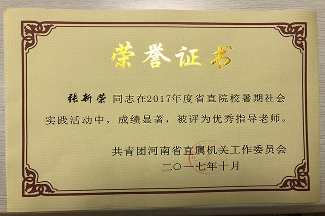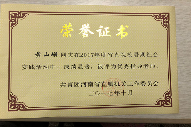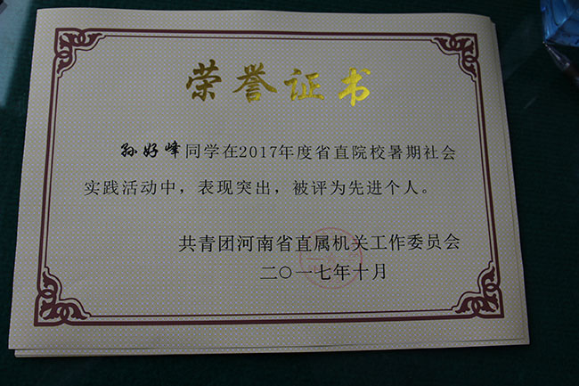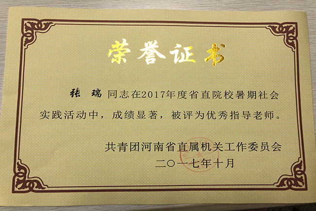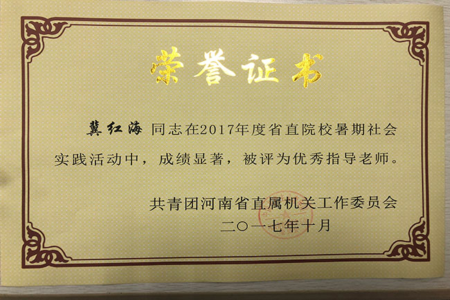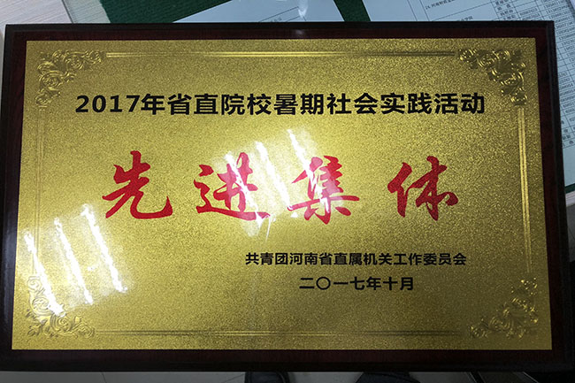 近日,省直团工委下发了《关于表彰2017年度省直院校暑期社会实践活动先进集体、优秀指导老师和先进个人的决定》(豫直团〔2017〕21号)文件,校团委荣获“2017年省直院校暑期社会实践活动先进集体”荣誉称号,冀红海、张新荣、张瑞、黄山珊等4位老师被评为“优秀指导老师”,牛鹏凯等10位同学被评为“先进个人”。
