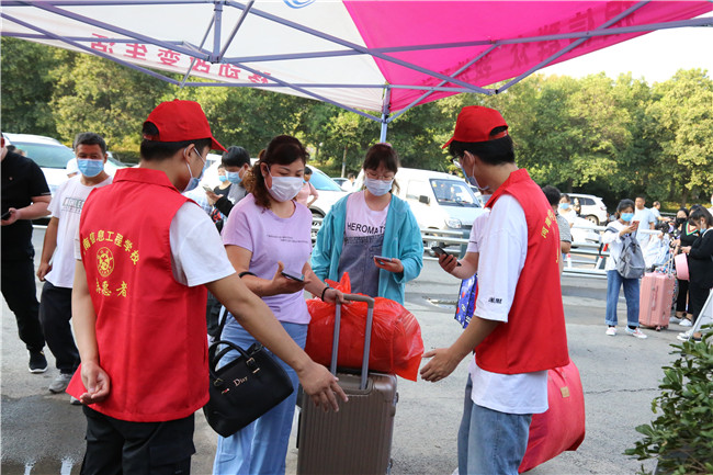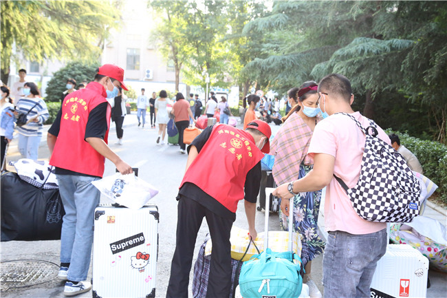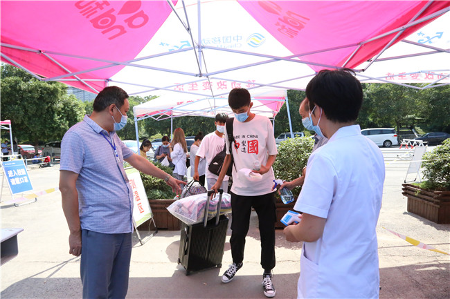 金风送爽,碧空澄澈。上午7点,学校门口排队入校的新生和家长已经比肩继踵。经过扫码、消毒、测温等一系列流程,学生和家长方可入校。学生在老师和志愿者的引导下办理报到手续,结束后学生与家长步行至公寓门口办理入住手续,按学校要求对内务整理。各环节有条不紊,井然有序。