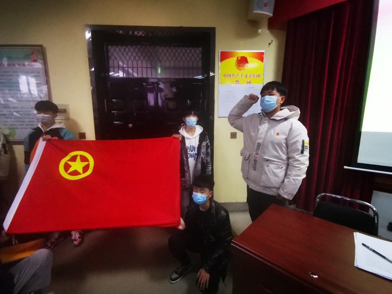 接着,在鲜艳的团旗下,由优秀团员代表冀诚铭(本校区)、党青峰(南校区)带领新入团团员进行了庄严宣誓。