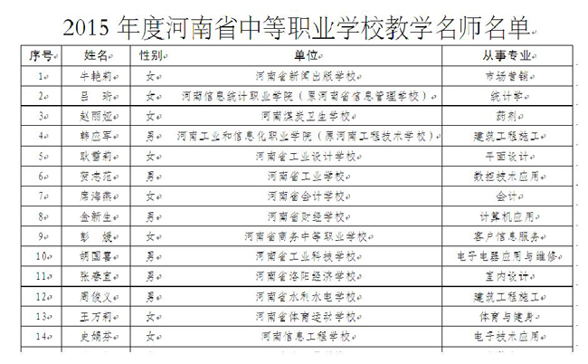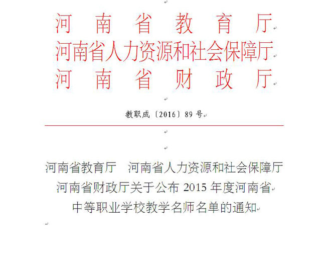 2015年底,由省教育厅、人社厅、财政厅联合开展的2015年河南省中等职业学校名师评选中,我校电子工程系史娟芬老师经过多轮评选,最终榜上有名。