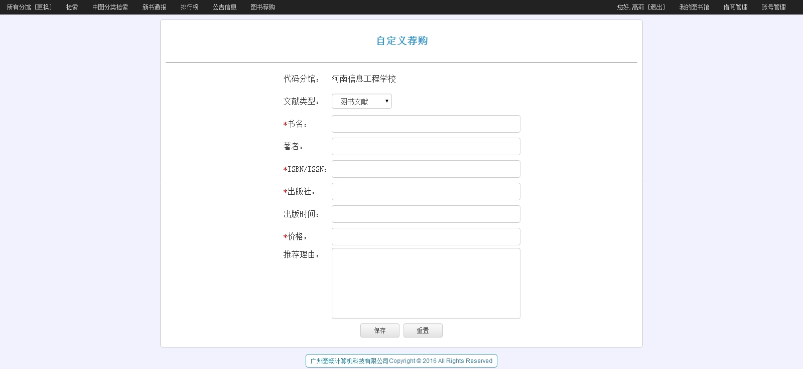 为适应我校教育教学需求,同时向广大师生提供更高质量的馆藏资源,图书馆现已开通图书检索平台荐购功能。每位教职工均可通过图书检索平台中选择符合学校发展的图书进行推荐购买。图书馆将会定期汇总读者所荐购的图书清单并进行采购。