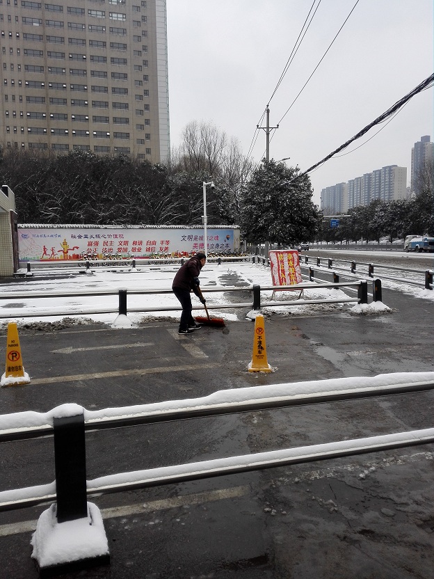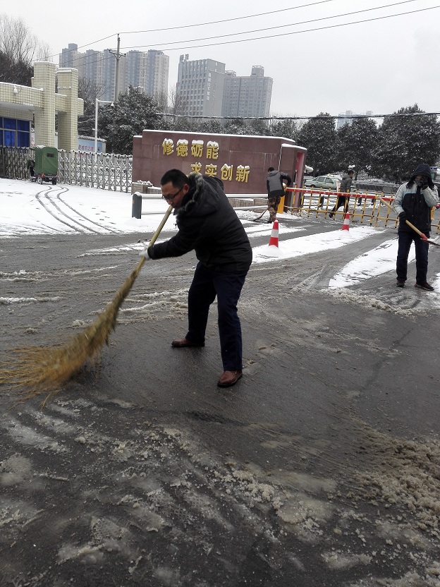 1月3日晚,郑州迎来入冬后的第一场雪。雪景很美,但道路上的积雪给人们的出行带来极大不便,尤其是有些融雪在路面结成了坚冰,存在很大安全隐患。1月4日下午,规划处和学校广大教职工自发组织起来,对校园主要通道及学校大门口的积雪和结冻路面进行了清扫和清除,排除了隐患,方便了广大师生和市民的行走。