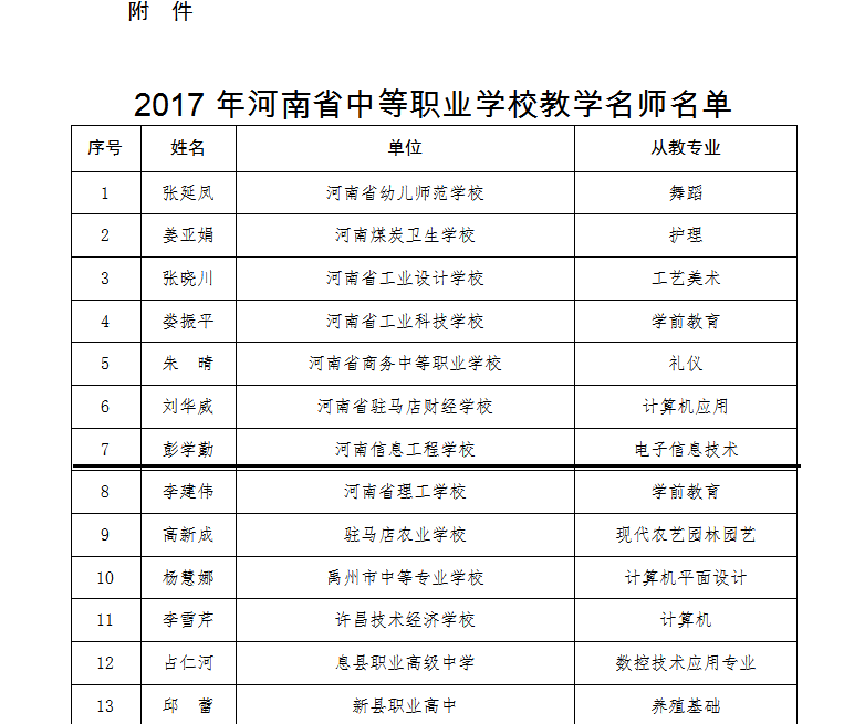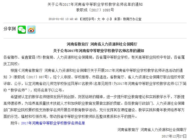 近日,河南省教育厅正式发布教职成〔2017〕1093号文件,公布2017年“河南省中等职业学校教学名师”名单,认定我校学徒制试点班学生导师彭学勤老师为2017年“河南省中等职业学校教学名师”。