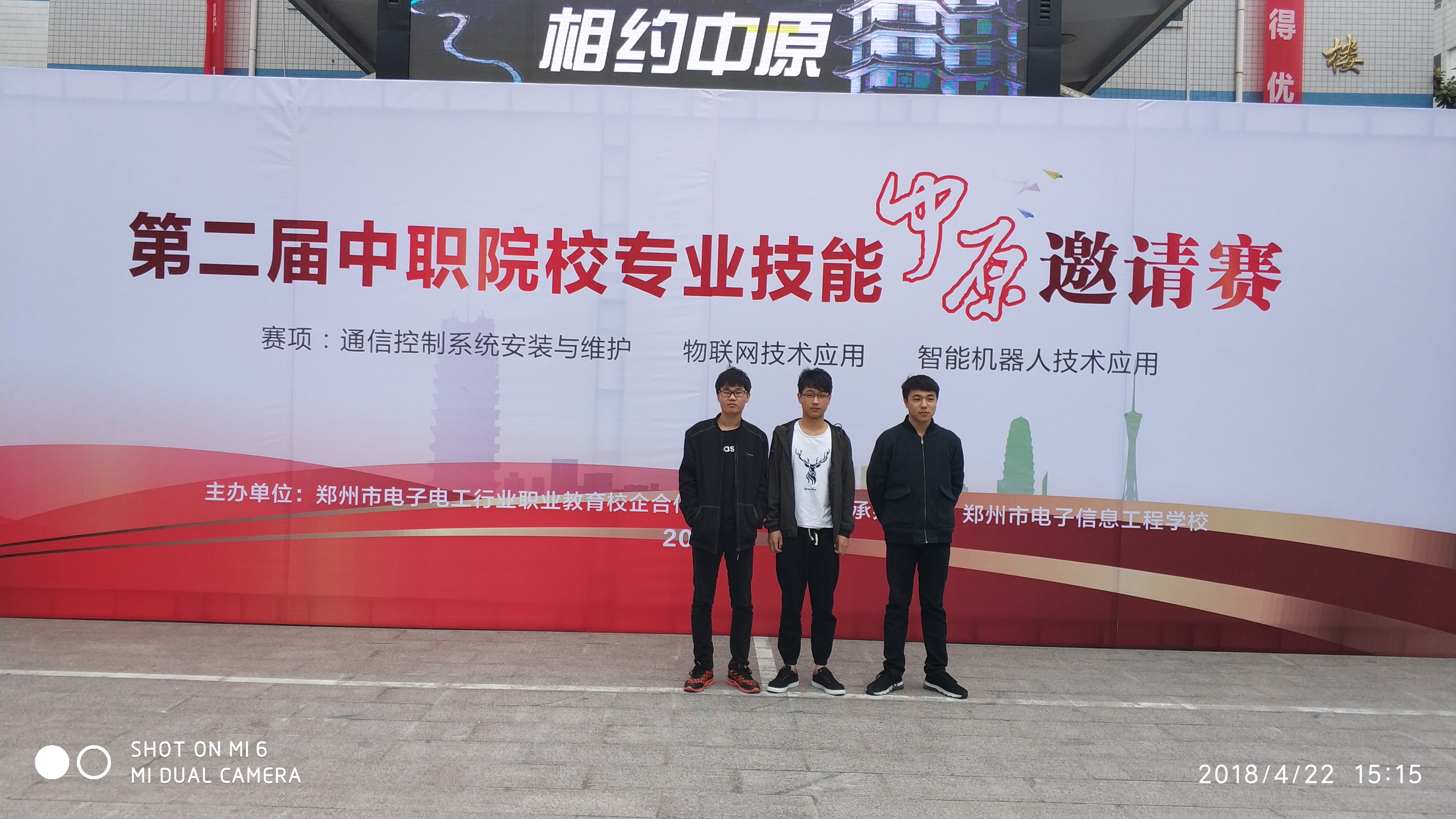 2018年4月22日至23日,由郑州市电子电工行业职业教育校企合作指导委员会主办的第二届中职院校专业技能中原邀请赛在郑州市电子信息工程学校举行。由我校电子工程系师生组成的河南信息工程学校代表队应邀参加了“通信控制系统安装与维护”和“物联网技术应用”两个赛项比赛。