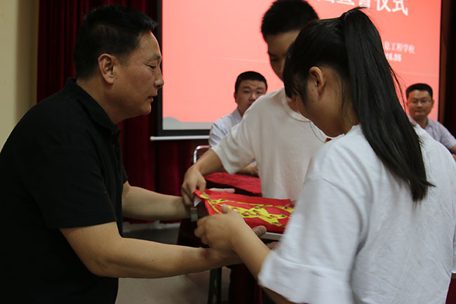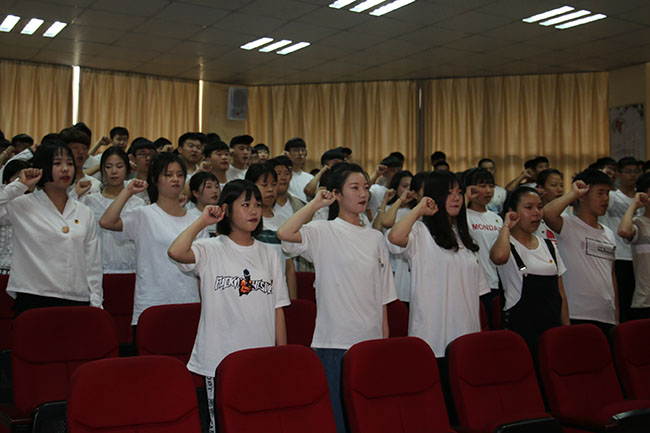 整个仪式秩序井然,气氛庄严肃穆。冀书记宣读了《关于批准王娇娇等77名同学入团的决定》,宋校长为新团员授团徽,马浩琼老师宣读团章中有关团员的义务和权利。77名新团员面对鲜艳的团旗,举起右拳庄严宣誓:“为共产主义事业而奋斗!”青春誓言、高昂雄浑,表达了同学们对共青团组织的无限向往和为团组织增光添彩的豪迈激情。新团员代表表示一定不辜负老师的殷切期望,时刻以一个共青团员的标准严格要求自己。老团员代表呼吁新团员要时刻牢记:我是一名共青团员,我要永远保持共青团员的光荣称号!让团徽在我胸前永远闪光。