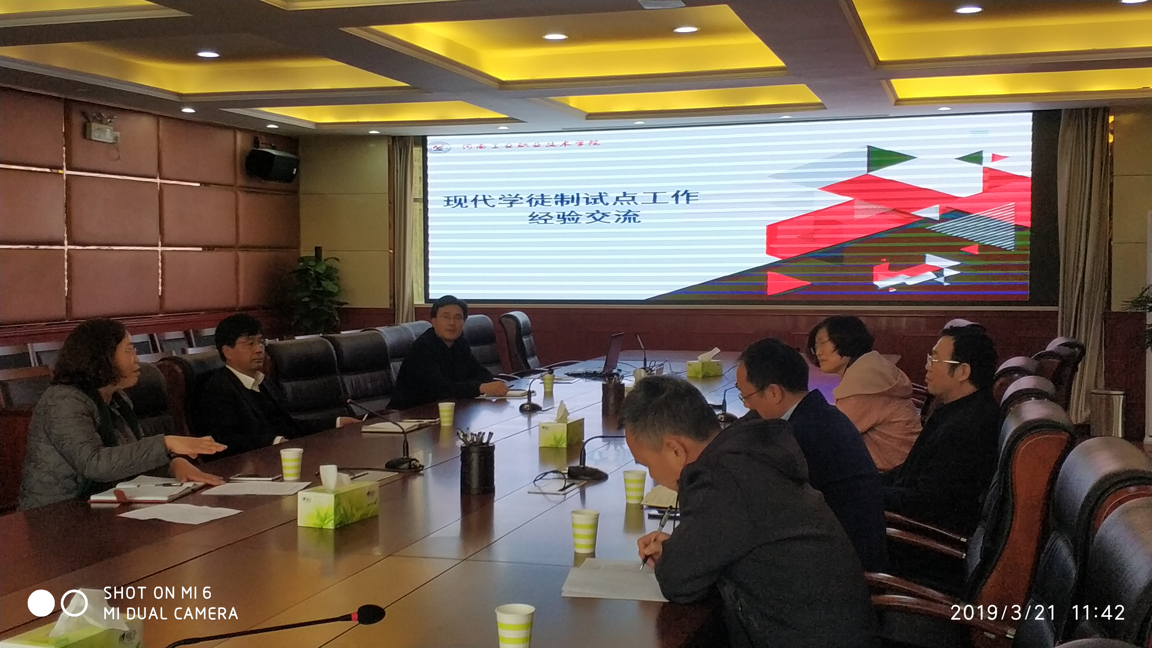 2019年3月21日上午,为了我校现代学徒制试点工作顺利进行,我校校长聂子明同志、副校长薛东亮同志带领规划发展处、电子工程系有关人员前往河南工业职业技术学院学习交流。