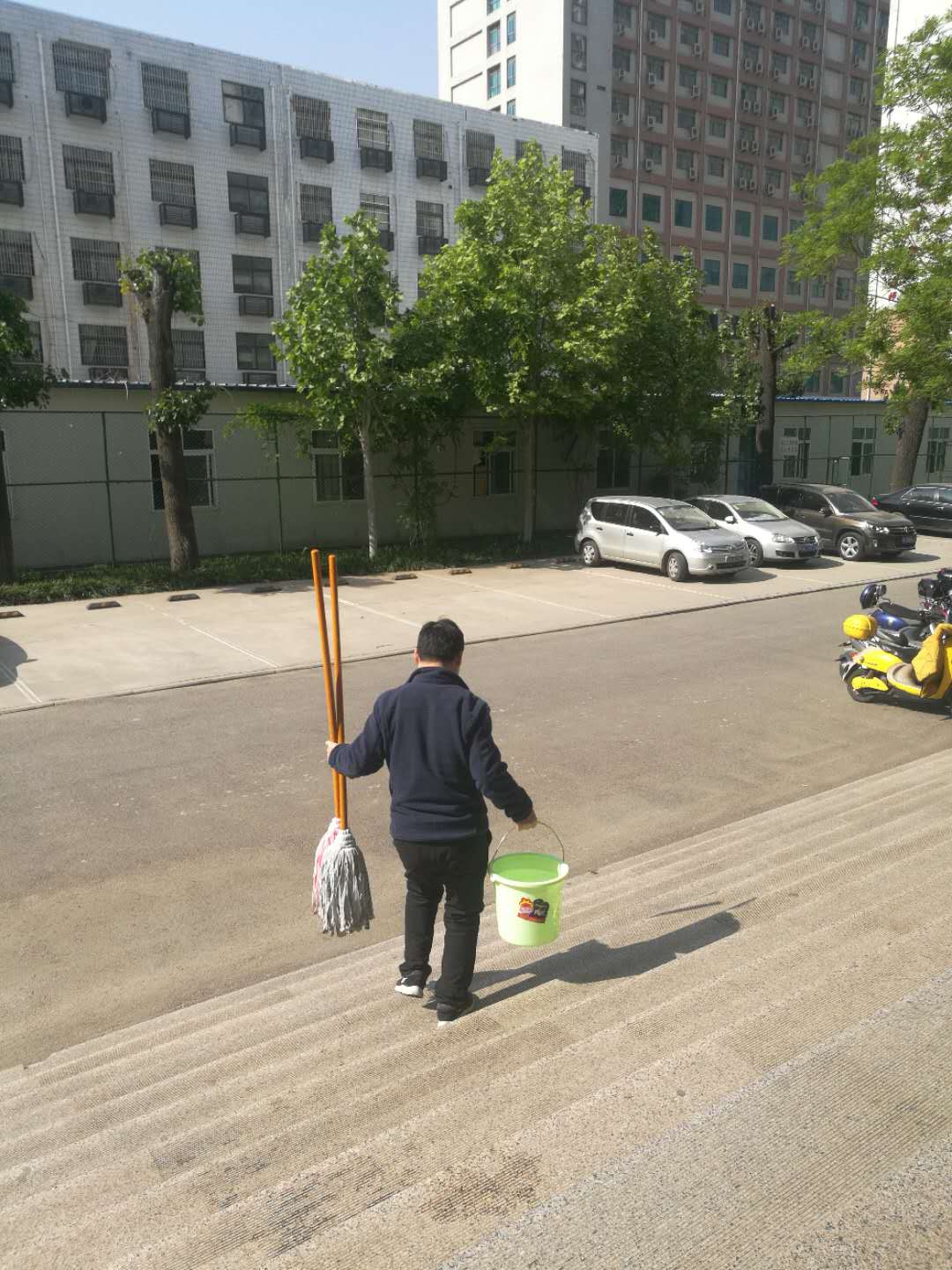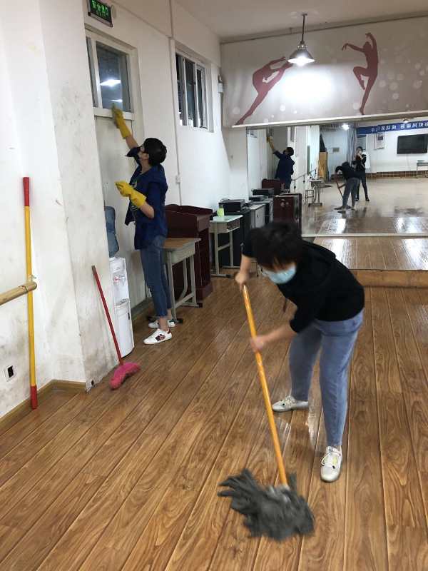 老师们拿着拖把、水盆、扫帚、抹布等工具,不怕脏、不怕累进行地毯式的打扫,做到灰尘无死角,室内环境干净整洁,空气流通无异味、地面无垃圾污渍、办公设备和教具清洁整齐无灰尘。经过一上午的打扫,实训室和办公室焕然一新,窗明几净,等待着同学们的归来。