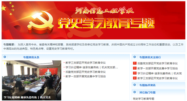 党史学习教育专题的入口链接设在学校官网首页右侧,包括上级精神、活动动态、支部风采、我为群众办实事、图文影像等栏目,旨在深入宣传中央、省委有关精神和部署,系统报道学校及各支部党史学习教育情况,提供党史学习教育的相关影像图文资料,使广大师生通过学习党史明理、增信、崇德、力行,筑牢我校立德树人之根本,为建党百年献礼!