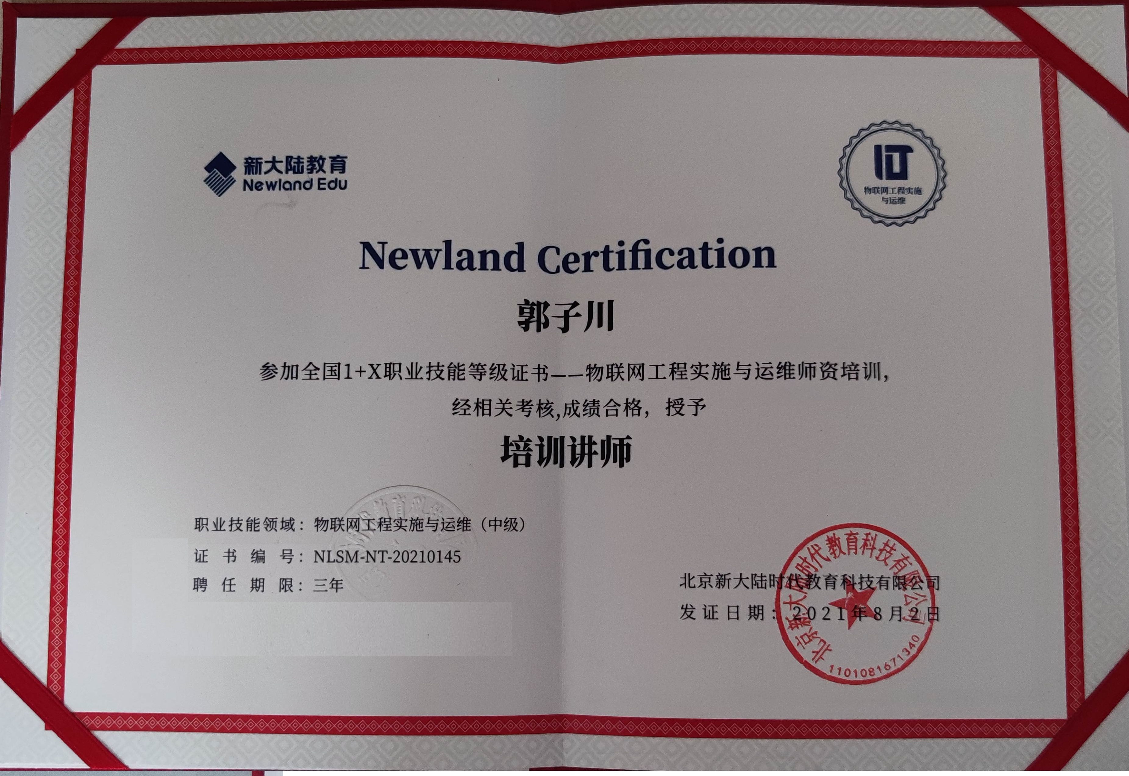 为了贯彻教育部等四部门《关于在院校实施“学历证书+若干职业技能等级证书”制度试点方案》、切实推进我校1+X证书制度试点工作顺利开展,加快1+X证书师资队伍建设,我校电子工程系郭子川教师参加了在重庆电子工程职业学院举行的1+X物联网工程实施与运维职业技能等级证书师资培训。经过培训,我系教师顺利通过理论和实操考核,获得1+X培训讲师证书。