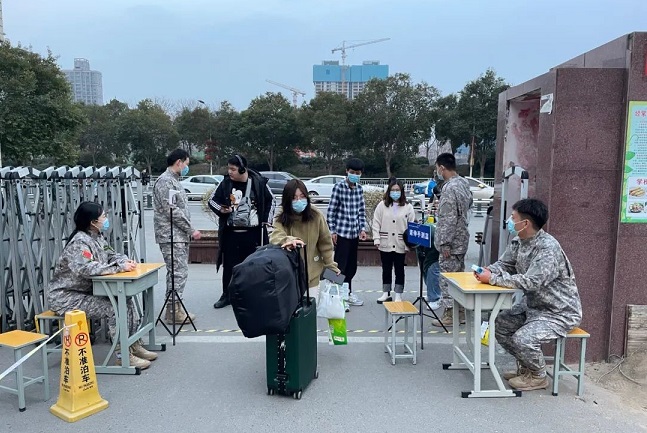 2月25日,微风和煦,阳光明媚,踏着春天的脚步,我校迎来了 2022年春季学期首批返校学生。校党委书记宋廷楷带领学生处、总务处医务室、保卫处、党政办的负责同志和学校教官及有关部门人员到学校大门口迎接返校入学的学生们,安排布置学生入校扫码、测温、消毒的各项准备工作。返校学生在教官的指引下,依次扫码测温进入校园,回到已经打扫消毒干净的校舍。