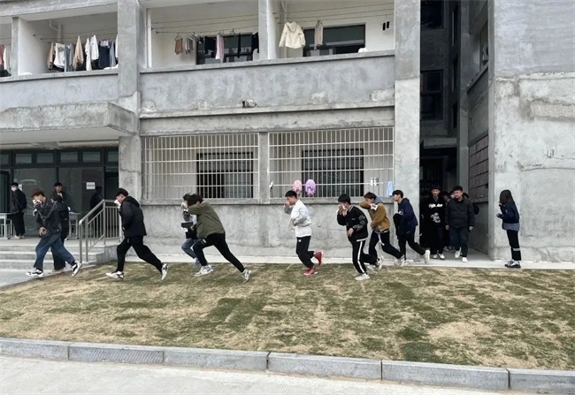 演练开始前,所有教官、班主任老师按楼层分配任务,保证每层宿舍楼的楼梯口、通道都有专人负责引导。另外安排分流人员在一楼大厅负责分流人群,避免出现拥堵。