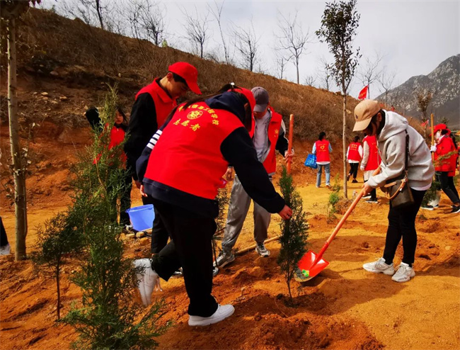 活动现场,旗帜飘扬,志愿者们分工明确,密切协作,按照树苗种植间距1米×1米,树穴直径0.6米、深度0.6米的要求,挥掀铲土、扶苗、培土、浇水、踩实,合力栽下一棵棵绿化树苗,现场一片热火朝天的劳动景象。新栽植的一排排侧柏、油松昂然挺立,为嵩山增添了浓浓绿意。