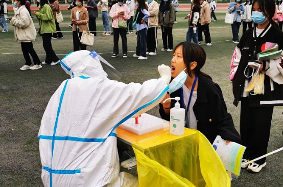 按照上级领导部门要求,全校4300余名师生每天按时完成核酸检测。为保证检测工作迅速有序开展,我校的红马甲志愿者队伍,毫无怨言一次次走向检测战场,医务室工作人员加入“大白”队伍亲自披挂上阵,脸上布满勒痕,写满疲惫,令人敬佩。