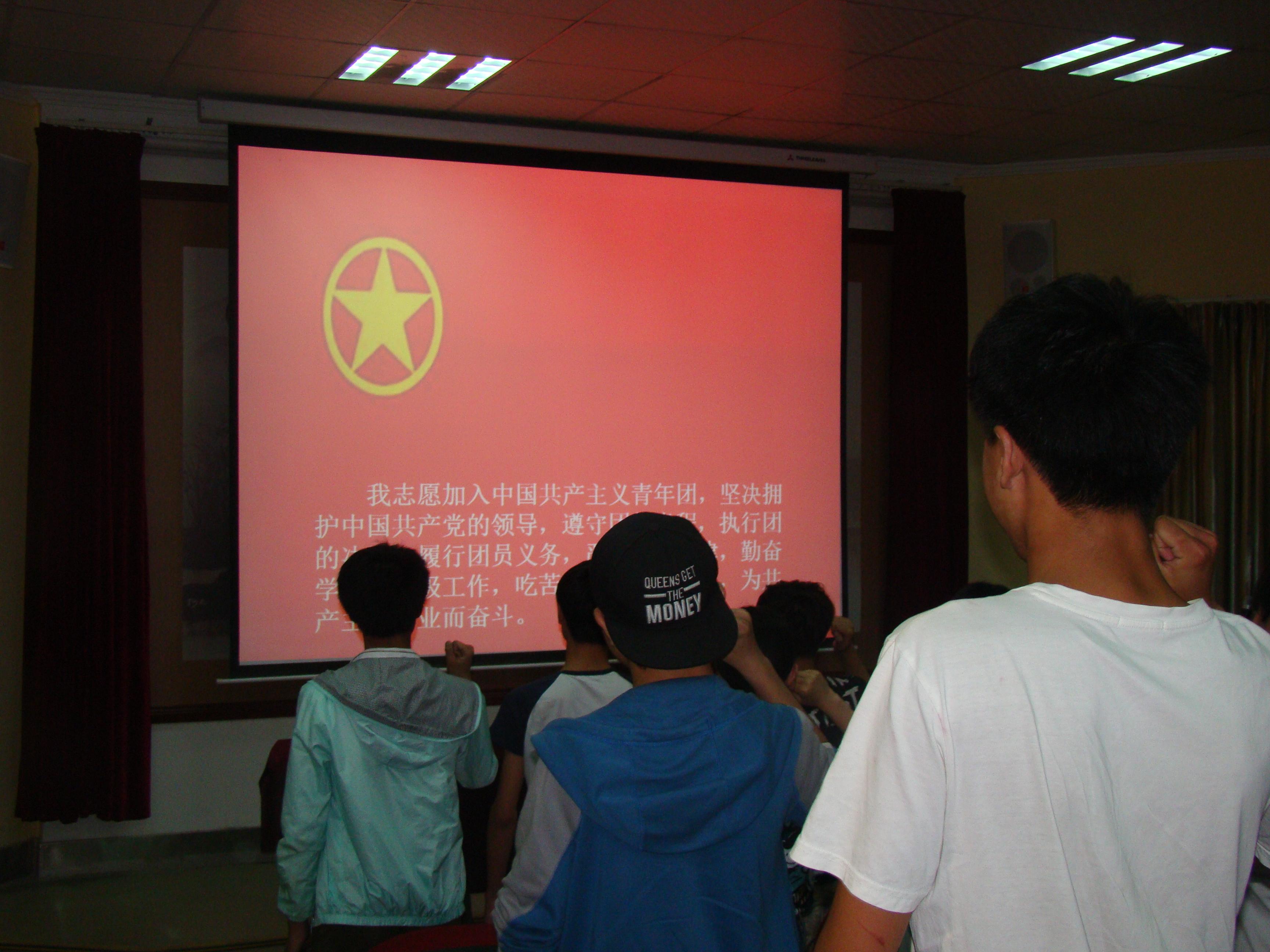 20位新团员和40多位老团员一起,面对鲜艳团旗,举起右手庄严宣誓:"我志愿加入中国共产主义青年团,坚决拥护中国共产党的领导,遵守团的章程……为共产主义而奋斗。" 青春誓言、高昂雄浑,表达了同学们对共青团组织的向往和为团组织增光添彩的豪迈激情!