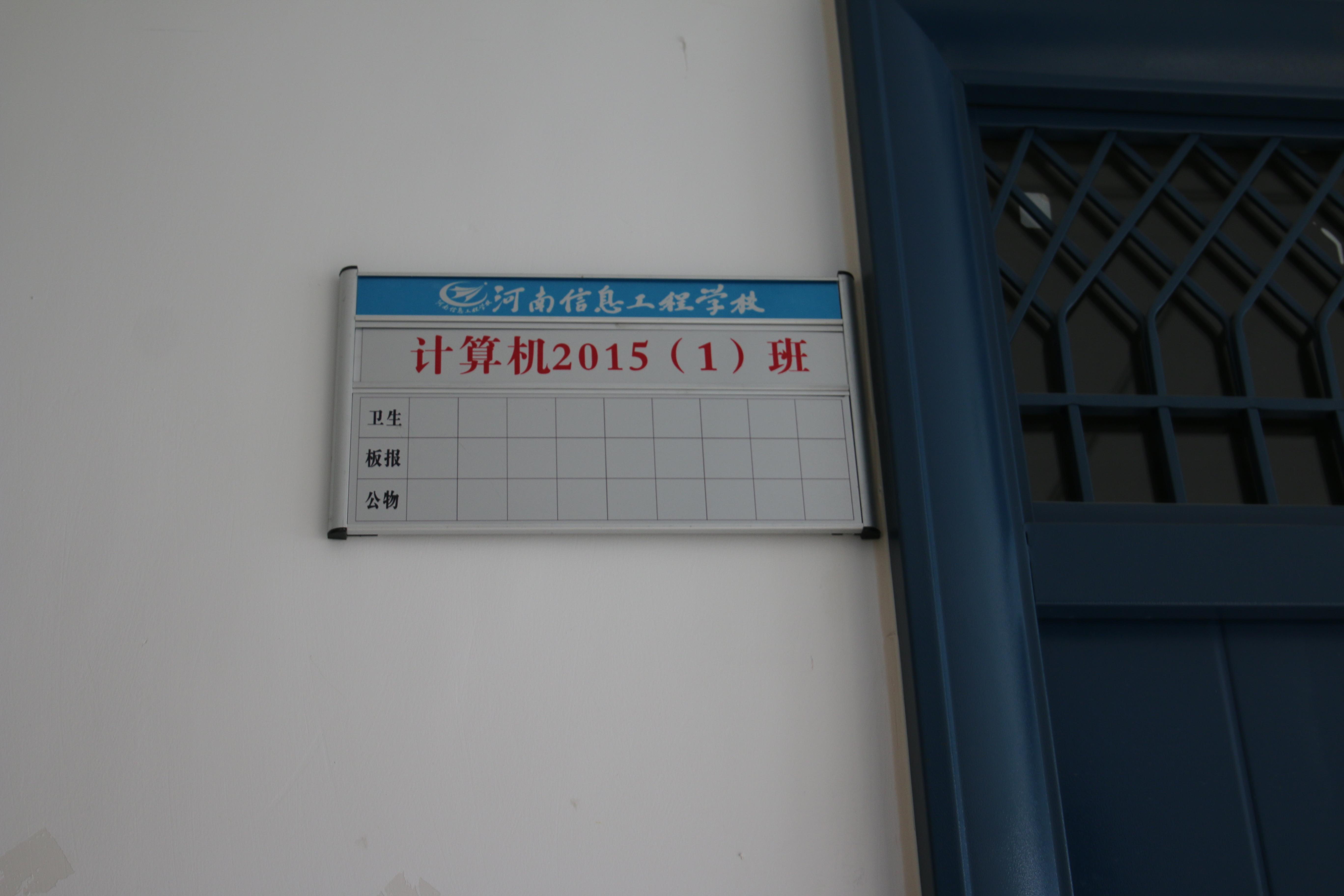 为了规范化、制度化管理,便于及时了解每个班级的卫生、板报、公共财产的情况,近日,学生处在教学楼各个班级门口统一悬挂标示标牌。标牌共分为五个部分,第一部分是学校名称“河南信息工程学校”,第二部分是班级,如计算机2015(1)班,后三部分是各个班级的情况,包含卫生、板报、公物三个方面,后面有若干方格,是为了及时张贴检查的情况,如好的班级会张贴红色五星,便于及时通报。